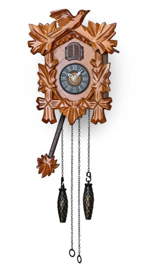 The first cuckoo clock was developed by german clockmakers in the 18th century. The clock was made of wood and resembled a small rural house with a small cuckoo bird living under the roof. The bird appears in the beginning of each hour, flaps its wings and sings. The traditional cuckoo clock movement is driven by suspended weights. The timekeeping was ensured by a heavy pendulum.